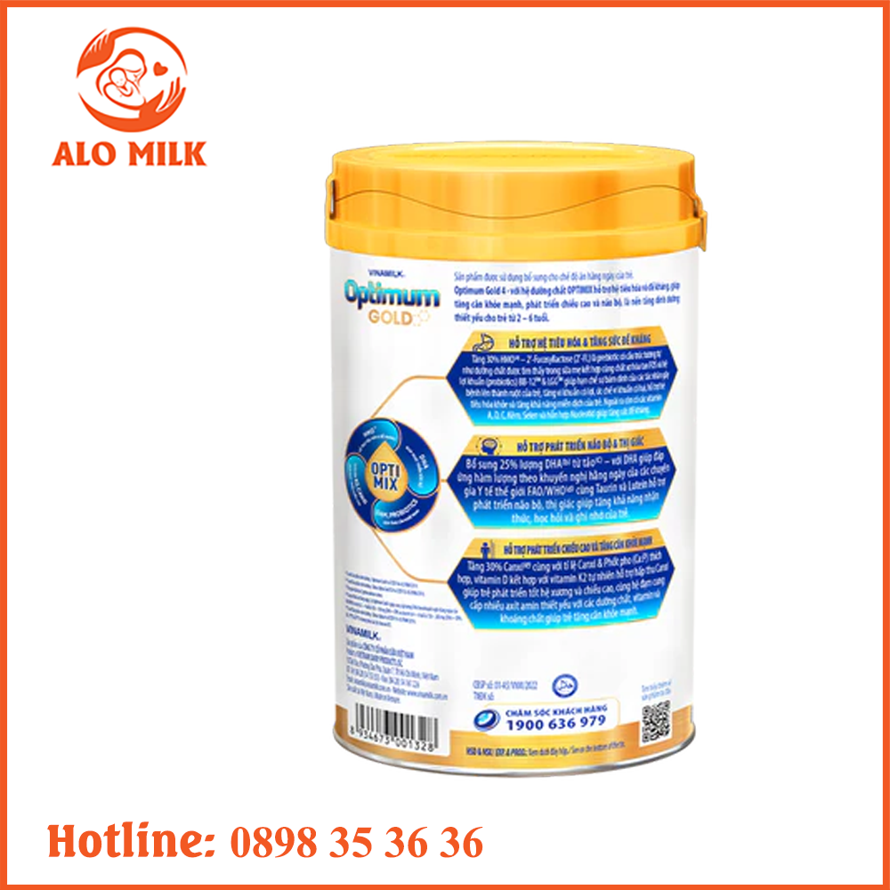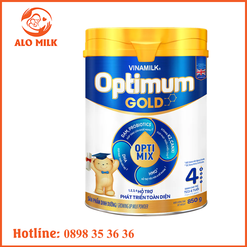 Sữa Optimum Gold số 4 bổ sung hơn 20% DHA từ tảo, hỗ trợ phát triển não bộ và giúp đáp ứng hàm lượng theo khuyến nghị hằng ngày của các chuyên gia y tế Thế Giới FAO/WHO
